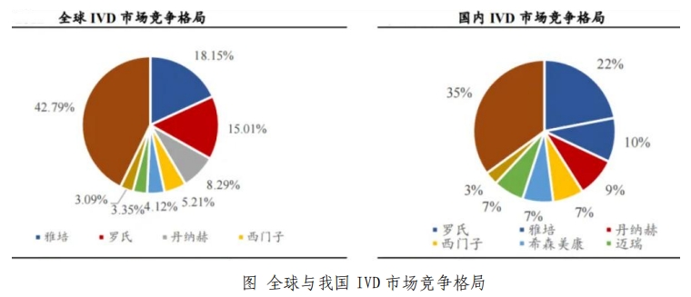 我國IVD市場格局同樣由進口品牌主導(dǎo),CR5為 55%,前五名分別為羅氏、雅培、丹納赫、西門子和希森美康。市場份額領(lǐng)先的國產(chǎn)企業(yè)有邁瑞和安圖,二者份額之和僅占約10%,其他國內(nèi)廠家規(guī)模較小、市占率較低。外資企業(yè)憑借其中高端領(lǐng)域的技術(shù)優(yōu)勢以及在中高端領(lǐng)域的“儀器+試劑”一體化平臺壟斷市場,但疫情帶來的診療需求及IVD集采的落地將促進國內(nèi)IVD企業(yè)迅速發(fā)展,加速進口替代,進一步擴大市場份額。