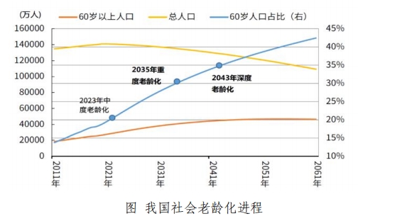 我國已于1999年步入老齡化社會,且程度繼續(xù)加深。截至2023年末,60周歲以上的人口數(shù)量已經(jīng)增長至29697萬人,占全部人口數(shù)量的比重為21.1%,進入中度老齡化社會。