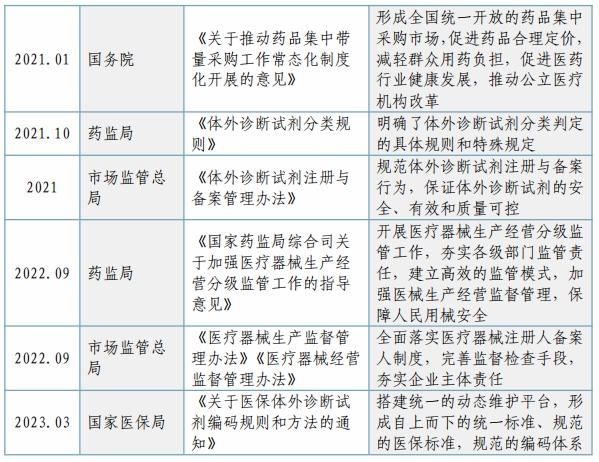 從2021年開始,國家陸續(xù)更新完善了醫(yī)療器械和體外診斷生產(chǎn)、監(jiān)管方面的法律法規(guī),頒布多項政策支持體外診斷領(lǐng)域的發(fā)展,同時致力于推進體外診斷領(lǐng)域的集采常態(tài)化。2023年3月,國家醫(yī)療保障局出臺了針對體外診斷試劑編碼的規(guī)則辦法,標(biāo)志著我國體外診斷市場向規(guī)范化發(fā)展。多項利好政策和供給端的激烈競爭將推動國內(nèi)IVD廠商加大研發(fā)力度,在集采政策下積極布局國際市場和非公立醫(yī)院等新市場,開發(fā)新產(chǎn)品,從內(nèi)部刺激企業(yè)自主創(chuàng)新,驅(qū)動IVD市場發(fā)展。
