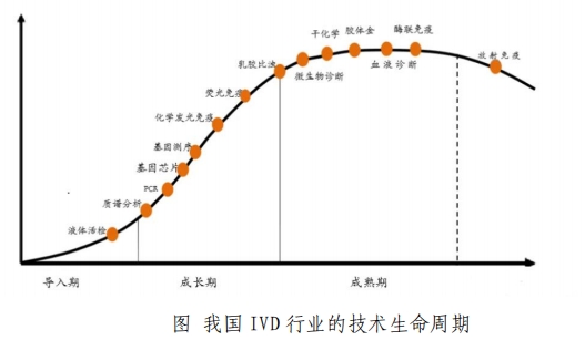 我國IVD技術(shù)經(jīng)歷了傳統(tǒng)化學(xué)反應(yīng)、酶催化反應(yīng)、免疫診斷和分子診斷的發(fā)展歷程,逐步向靈敏度高、特異性強、檢測速度快和低成本的方向迅速發(fā)展。目前放射免疫處于衰退期,化學(xué)發(fā)光免疫、分子診斷相關(guān)的基因測序、基因芯片、PCR則處于成長期,建議在具備高成長性的細(xì)分領(lǐng)域內(nèi)尋找投資機會。