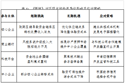 《新規(guī)》的出臺標(biāo)志著中國供應(yīng)鏈金融從“規(guī)模擴(kuò)張”轉(zhuǎn)向“質(zhì)效并重”的新發(fā)展階段。短期來看,電子憑證業(yè)務(wù)整頓、核心企業(yè)責(zé)任強(qiáng)化將重塑行業(yè)競爭格局,約23%的存量憑證(9.6萬億元)面臨調(diào)整,科技平臺盈利模式亟待重構(gòu);中長期則通過技術(shù)賦能和制度創(chuàng)新,推動(dòng)行業(yè)從“信用中介”向“信息樞紐”、從“核心依賴”向“生態(tài)共贏”轉(zhuǎn)型。