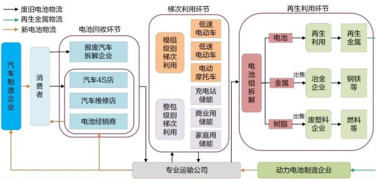 從產(chǎn)業(yè)鏈角度來講,動力電池回收與綜合利用行業(yè)分為梯次利用產(chǎn)業(yè)鏈和再生利用產(chǎn)業(yè)鏈。當(dāng)動力電池容量衰減至初始容量的80%以下時,電池或不再適合電動汽車使用,但可在儲能系統(tǒng)(電網(wǎng)調(diào)峰調(diào)頻、削峰填谷、風(fēng)光儲能等)、低速電動工具等場景中實現(xiàn)二次利用,即梯次利用;當(dāng)電池容量衰減至初始容量的40%以下時,則可通過拆解回收,提取其中的鋰、鈷、鎳等高價值金屬材料,實現(xiàn)資源再生利用。所以梯次利用產(chǎn)業(yè)鏈的上游主要為電池材料企業(yè),中游包括電池生產(chǎn)制造企業(yè)、儲能企業(yè)、電池綜合服務(wù)企業(yè),下游則是電池再利用領(lǐng)域的通信企業(yè)、低速電動生產(chǎn)企業(yè)等;對于再生利用產(chǎn)業(yè)鏈,其上游主要是電池生產(chǎn)制造企業(yè),中游是提供回收渠道的物流企業(yè)、環(huán)保企業(yè)及電池檢測企業(yè),下游則是電池材料企業(yè)。