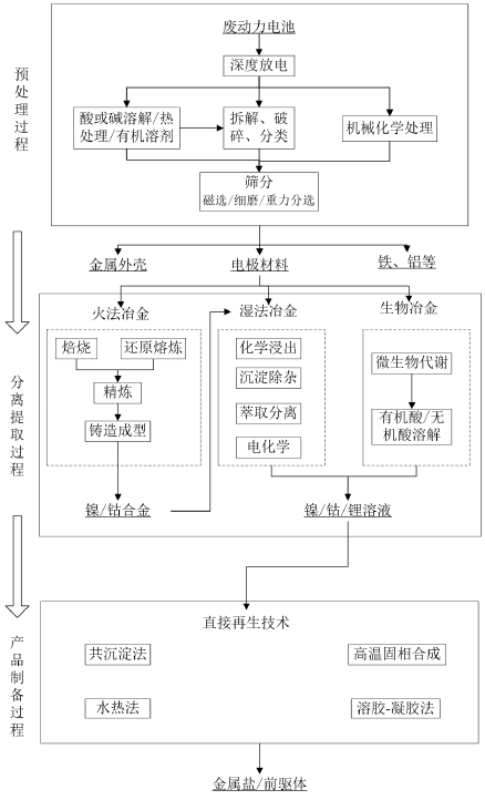 動力電池拆解回收,即將廢舊電池進(jìn)行物理或化學(xué)拆解,提取其中的金屬或化合物,進(jìn)行精煉或再生利用。不同于廢舊電池梯次利用存在商業(yè)化進(jìn)展緩慢,經(jīng)濟(jì)性、安全性面臨較大挑戰(zhàn)等問題,動力電池拆解回收工藝已經(jīng)較為成熟,主要可以分為預(yù)處理、分離提?。ㄉ疃忍幚恚a(chǎn)品制備等過程。