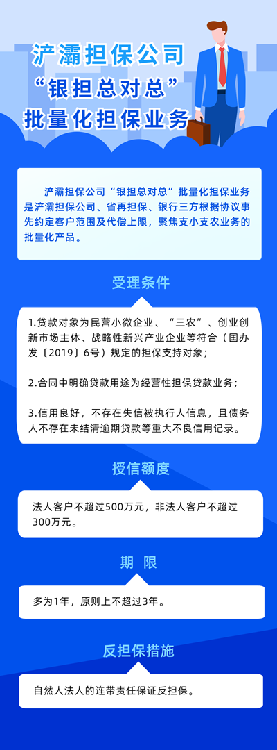 “銀擔(dān)總對(duì)總”批量擔(dān)保業(yè)務(wù)是政府性融資擔(dān)保機(jī)構(gòu)與銀行業(yè)金融機(jī)構(gòu)為高效實(shí)現(xiàn)貸款與擔(dān)保服務(wù)推出的創(chuàng)新舉措。該模式主要由銀行負(fù)責(zé)對(duì)貸款項(xiàng)目進(jìn)行風(fēng)險(xiǎn)識(shí)別、評(píng)估和審批,再由擔(dān)保機(jī)構(gòu)對(duì)貸款進(jìn)行合規(guī)性審核確認(rèn),批量進(jìn)行再擔(dān)保備案,納入全國(guó)政府性融資擔(dān)保體系。該產(chǎn)品有效增加了銀行對(duì)缺少抵押物的小微企業(yè)的貸款意愿。